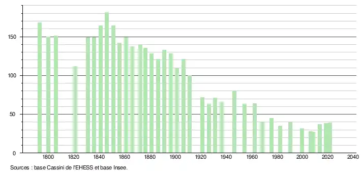 L'évolution du nombre d'habitants est connue à travers les recensements de la population effectués dans la commune depuis 1793. Pour les communes de moins de 10 000 habitants, une enquête de recensement portant sur toute la population est réalisée tous les cinq ans, les populations légales des années intermédiaires étant quant à elles estimées par interpolation ou extrapolation[36]. Pour la commune, le premier recensement exhaustif entrant dans le cadre du nouveau dispositif a été réalisé en 2008[37].