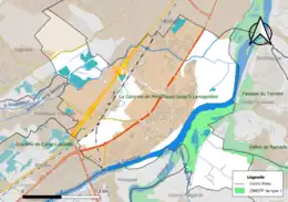 L'occupation des sols de la commune, telle qu'elle ressort de la base de données européenne d’occupation biophysique des sols Corine Land Cover (CLC), est marquée par l'importance des territoires artificialisés (58,8 % en 2018), en augmentation par rapport à 1990 (53,3 %). La répartition détaillée en 2018 est la suivante : zones industrielles ou commerciales et réseaux de communication (30,7 %), zones urbanisées (26,2 %), terres arables (14,9 %), zones agricoles hétérogènes (12,8 %), forêts (6,5 %), eaux continentales[Note 7] (4,9 %), mines, décharges et chantiers (1,8 %), cultures permanentes (1,7 %), milieux à végétation arbustive et/ou herbacée (0,6 %), espaces verts artificialisés, non agricoles (0,1 %)[36]. L'évolution de l’occupation des sols de la commune et de ses infrastructures peut être observée sur les différentes représentations cartographiques du territoire : la carte de Cassini (XVIIIe siècle), la carte d'état-major (1820-1866) et les cartes ou photos aériennes de l'IGN pour la période actuelle (1950 à aujourd'hui)[Carte 2].