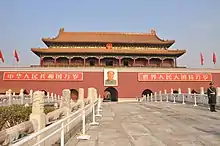 De part et d'autre du portrait, se trouvent aujourd’hui deux immenses calicots, l'un, sur la gauche, portant la mention « Vive la république populaire de Chine » (中华人民共和国万岁, en pinyin : zhōnghuá rénmín gònghéguó wànsuì) et l'autre, à droite, proclamant « Vive la grande union des peuples du monde » (世界人民大团结万岁, en pinyin : shìjiè rénmín dàtuānjié wànsuì). Ce dernier calicot a pris en 1950 la place d'un autre, dont le slogan était « Vive le gouvernement central populaire » (中央人民政府万岁, en pinyin : Zhongyang renmin zhengfu wansui).