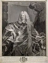 - Gravé par G. A. Müller en contrepartie de la gravure de Drevet. Sous le cadre, la lettre suivante : « PHILIPPVS LVDOVICVS Sac(ri). Rom(ani). Imperii Haereditarius Thesaurarius Comes a SINZENDORF Liber Baro in Ernstbrun, Dominus in Geföll, Superiori Selovitz & Carlswald, Schritenz, Freyholtzmühl Berenau, Fridenau, Smilau & Bastinau, Burgravius in Rheinek, Supremus Haereditarius Scutifer, ac Praecisor in Superiori & inferiori Austria, Haereditarius Pincerna in Austria ad Anasum, Aurei Velleris Eques, Sacratissimae Caes(areae) Regiaeque Catholicae Majestatis Camerarins, Consiliarius actualis intimus ac Conferentiaeis & Supremus Aulae Cancellarius &c. &c ». En bas, de part et d’autre de l’estampe : « H. Rigaud pinxit Par(isiis) - G. A. Müller S(acrae). C(aesareae) et C(atholieae) M(aiestatis) Chalcograph(us) fe(cit) Viennae ».