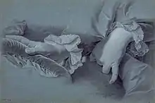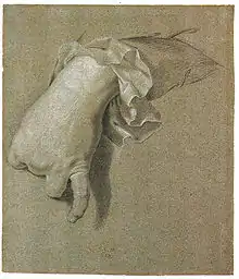 - Autre étude de la main droite par le même. Pierre noire et craie blanche sur papier bleu. H. 30,7 ; L. 26,7. Collection particulière. Monogrammé et daté : « J.G.W./1739 ». Exposé à Paris, Galerie Patrick Perrin, 1991, no 21.