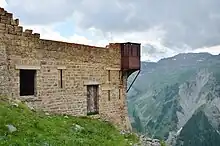 - Le blockhaus du Mont des Fourches qui domine tous les environs avec son échauguette en tôle d'acier dont les éléments sont boulonnés afin de pouvoir être transportés à dos de mulet[3]. Construit à partir de 1898 et remanié en 1903-1905[4] il est plus imposant que les deux autres blockhaus de la position. On trouve à l'intérieur une chambrée pour cinquante hommes en deux travées de lits de camps superposés ainsi que, légèrement surélevées, une cuisine et la chambre d'officier. Au-dessus de l'ensemble, un toit en terrasse servait de plate-forme de tir pour les fantassins et desservait aussi l'échauguette situé en encorbellement dans l'angle nord-ouest ; les murs crénelés qui entouraient le toit-terrasse ont aujourd'hui disparu. On accédait à cette terrasse par des échelons de barreaux métalliques fixés contre le mur d'une tour carrée située dans l'angle sud-est, à côté de la chambre de l'officier, et qui assurait le flanquement de deux côtés du blockhaus. La façade ouest était percée de créneaux de tir verticaux, l'accès s'effectuant depuis deux portes donnant sur la chambrée. La façade ouest avait quant à elle deux niveaux superposés de créneaux horizontaux.