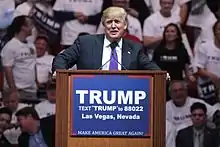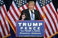Au mois d', Trump choisit d'embaucher comme « directeur général de campagne » l'ultraconservateur Stephen Bannon, alors directeur de BreitBart News, un site d'information « politico-trash »[128] très populaire au sein de la mouvance de l'Alt-right. Cette « droite alternative » désigne différentes franges du mouvement conservateur américain partageant certaines idéologies, principalement racialistes ou racistes comme le nationalisme blanc ou le suprémacisme, et qui toutes sont hostiles à l'immigration, au multiculturalisme et au « politiquement correct », autant de thèmes utilisés par Trump pour sa campagne.