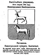 - (ru) Закон № 15.208 от 16 августа 1781 года. Высочайше утверждённый доклад Сената «О утверждении гербов городам Нижегородского наместничества», lire en ligne, in Полное собрание законов Российской империи. Собрание Первое. 1649—1825 гг., Санкт-Петербург, Типография II отделения Собственной Е. И. В. канцелярии, 1830,|том XXI (1781-1783) pages 220-221