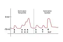- La sommation temporelle : Un stimulus sera appliqué plusieurs fois de suite, de manière très rapprochées sur un seul site de stimulation. La variation du potentiel de membrane s'amplifie car la réponse s'additionne dans le temps ;