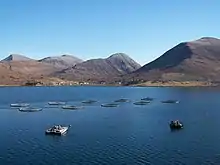 Salmoniculture bio, en cages flottantes sur loch Linnhe (Écosse)