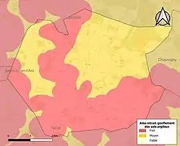 Les mouvements de terrains susceptibles de se produire sur la commune sont des tassements différentiels[16]. Le retrait-gonflement des sols argileux est susceptible d'engendrer des dommages importants aux bâtiments en cas d’alternance de périodes de sécheresse et de pluie[17]. La totalité de la commune est en aléa moyen ou fort (79,5 % au niveau départemental et 48,5 % au niveau national)[Carte 2]. Depuis le , en application de la loi ÉLAN, différentes contraintes s'imposent aux vendeurs, maîtres d'ouvrages ou constructeurs de biens situés dans une zone classée en aléa moyen ou fort[Note 3],[18].