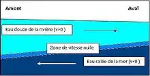 Au fil des semaines, les jeunes larves dérivent jusqu’à un estuaire, où elles pourront se nourrir et croître. Cette dérive des œufs et des larves dépend du débit. Dans le cas des rivières à frasil, la formation d’un barrage de frasil contribue aussi à la rétention des œufs et des larves. Les températures et les débits élevés peuvent causer une dérive massive des embryons et des œufs. Dans le cas du fleuve Saint-Laurent, les larves de poulamons s’accumulent dans la zone de l’extrémité est de l’Île d’Orléans, où les courants de marées remontent, entraînant une grande quantité de particules, qui rendent l’eau turbide et riche en nutriments. Afin de rester dans l’estuaire, qui constitue un lieu favorable à leur croissance, les poulamons se positionnent surtout à la profondeur à laquelle le courant est nul, c’est-à-dire entre le courant descendant de l’eau plus douce de la surface, et celui de l’eau salée du fond qui remonte vers les terres, lors des épisodes de marée (voir fig.1).