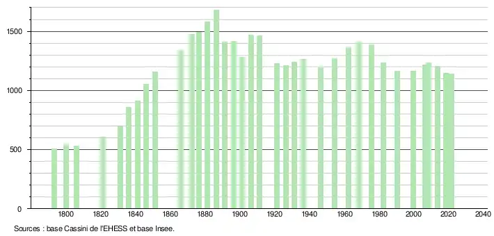L'évolution du nombre d'habitants est connue à travers les recensements de la population effectués dans la commune depuis 1793. Pour les communes de moins de 10 000 habitants, une enquête de recensement portant sur toute la population est réalisée tous les cinq ans, les populations légales des années intermédiaires étant quant à elles estimées par interpolation ou extrapolation[21]. Pour la commune, le premier recensement exhaustif entrant dans le cadre du nouveau dispositif a été réalisé en 2008[22].