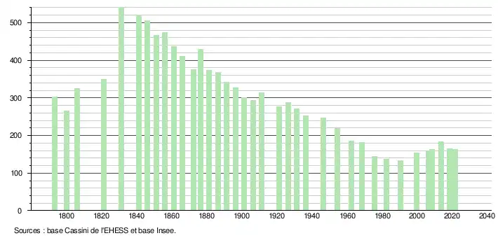 | L'évolution du nombre d'habitants est connue à travers les recensements de la population effectués dans la commune depuis 1793. Pour les communes de moins de 10 000 habitants, une enquête de recensement portant sur toute la population est réalisée tous les cinq ans, les populations légales des années intermédiaires étant quant à elles estimées par interpolation ou extrapolation[24]. Pour la commune, le premier recensement exhaustif entrant dans le cadre du nouveau dispositif a été réalisé en 2008[25]. En 2021, la commune comptait 163 habitants[Note 3], en diminution de 12,37 % par rapport à 2015 (Gers : +0,79 %, France hors Mayotte : +1,84 %). |