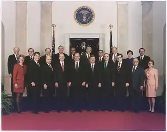 Bush conserva dans son cabinet une partie des membres de l'administration Reagan, dont le secrétaire du Trésor Nicholas Brady, le procureur général Dick Thornburgh et le secrétaire à l'Éducation Lauro Cavazos[19]. La première nomination importante de Bush fut celle de James Baker en tant que secrétaire d'État. Baker était un ami proche du nouveau président et il avait servi comme chef d'état-major de la Maison-Blanche sous Reagan[20]. Le choix initial de Bush pour le poste de secrétaire à la Défense, John Tower, fut rejeté par le Sénat, une première pour un individu désigné à un poste du cabinet par un président entrant. Bush se tourna alors vers Dick Cheney, ancien chef de cabinet du président Gerald Ford et futur vice-président des États-Unis sous George W. Bush[21]. Jack Kemp intégra le cabinet en tant que secrétaire au Logement et au Développement urbain alors qu'Elizabeth Dole, l'épouse de Bob Dole et ancienne secrétaire aux Transports, devint secrétaire du Travail au sein de l'administration Bush[22].