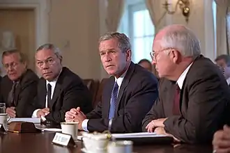 Dans les jours qui suivirent les attentats du 11 septembre, les « faucons » de l'administration Bush, en particulier Wolfowitz, réclamèrent une intervention militaire immédiate contre l'Irak mais ce projet fut temporairement écarté au profit de l'invasion de l'Afghanistan[97]. Les choses évoluèrent en lorsque l'administration Bush commença à mobiliser l'opinion publique et les parlementaires en faveur de l'invasion de l'Irak[98]. Un mois plus tard, le Congrès adopta une résolution qui autorisait le recours à la force contre le régime irakien. La mesure fut soutenue à l'unanimité par les républicains alors que leurs collègues démocrates se divisèrent sur la question, une moitié votant pour et l'autre moitié votant contre[99]. Cédant aux pressions qui s'exerçaient sur lui, aussi bien aux États-Unis qu'à l'étranger, pour la mise en place d'une action multilatérale, Bush chercha à faire approuver l'intervention en Irak par l'ONU[100]. Conduite par Powell, la délégation américaine arracha, en , le vote de la résolution 1441 du Conseil de sécurité des Nations unies qui enjoignait l'Irak de démanteler son programme d'ADM[101]. À ce stade, de nombreux hauts responsables du gouvernement américain étaient persuadés que Saddam Hussein possédait des armes de destruction massive et que ces ADM se retrouveraient, tôt ou tard, entre les mains d'Al-Qaïda ; le directeur de la CIA George Tenet assura lui-même à Bush que dénicher les stocks d'ADM irakiens ne serait qu'une « simple formalité »[102].