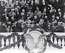 Hoover fut assermenté en tant que président le , sous l'autorité du juge en chef (et ancien président) William Howard Taft. Ce fut la première cérémonie d'investiture retransmise aux actualités cinématographiques[9]. Le discours inaugural de Hoover était empreint d'optimisme même si ce dernier parla du « mépris et de la désobéissance à la loi » qu'il considérait comme le problème « le plus pernicieux » auquel était confrontée la nation[10]. À la fin de son allocution, le nouveau président déclara avec confiance :