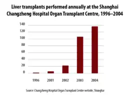 En 2006, la Chine était le deuxième pays au monde comptant le plus grand nombre de greffes, derrière les États-Unis[6],[7]. Alors qu'entre 1994 et 1999 on ne comptait que 18 500 greffes, soit une moyenne d’environ 3 000 par an[8], ce chiffre a culminé à plus de 10 000 greffes de rein en 2004 et près de 4 000 de foie en 2005[6]. Sur les seules greffes de reins, on dénombrait presque 20 000 transplantations en 2005[9].