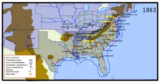 Grant remporta d'autres victoires à la bataille de Shiloh et lors du siège de Vicksburg qui affermirent la position de l'Union sur le Mississippi ; la prise de Vicksburg est ainsi considérée comme l'un des tournants de la guerre de Sécession[124]. En , Lincoln nomma Grant à la tête de la division militaire du Mississippi nouvellement créée, lui donnant le commandement de tout le théâtre occidental de la guerre[125]. Grant, avec les généraux Joseph Hooker, George H. Thomas et William Tecumseh Sherman, conduisit au mois de novembre la victorieuse campagne de Chattanooga, expulsant les troupes confédérées du Tennessee[126]. La chute de Chattanooga rendit la Géorgie vulnérable à une attaque et augmenta la possibilité pour l'Union de progresser vers l'océan Atlantique afin de couper en deux le territoire de la Confédération[127].