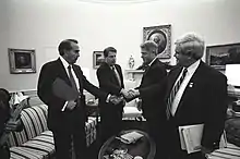 Lors de ce premier mandat, l'équipe de conseillers à la politique étrangère du président fut dirigée par le conseiller à la sécurité nationale Anthony Lake et par le secrétaire d'État Warren Christopher, qui avaient tous les deux servis dans la précédente administration Carter[17]. Le secrétaire à la Défense, Les Aspin, démissionna peu après la bataille de Mogadiscio et fut remplacé par William Perry[18]. Bentsen et McLarty démissionnèrent à leur tour en 1994 et furent remplacés respectivement par Rubin et Panetta[19]. Clinton ayant été réélu pour un second mandat, Panetta quitta ses fonctions et fut remplacé par l'ex-chef de cabinet adjoint Erskine Bowles[20]. Madeleine Albright devint la première femme secrétaire d'État et Sandy Berger succéda à Lake comme conseiller à la sécurité nationale tandis que l'ancien sénateur républicain William Cohen fut nommé secrétaire à la Défense[21]. Selon le journaliste John Harris, la proximité de Berger avec le président fit de lui le principal responsable de la politique étrangère du second mandat de Clinton, ainsi que le conseiller à la sécurité nationale le plus influent depuis Henry Kissinger[22]. John Podesta servit en tant que chef de cabinet à partir de 1998 alors que Lawrence Summers remplaça Rubin au secrétariat du Trésor en 1999[23].