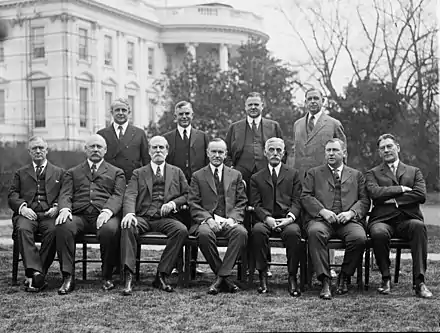 Le membre le plus influent du cabinet Coolidge fut probablement le secrétaire au Trésor Andrew Mellon qui avait la haute main sur la politique fiscale de l'administration et était considéré par beaucoup, y compris par le représentant démocrate du Texas John Nance Garner, comme étant plus puissant que Coolidge lui-même[6]. Le secrétaire au Commerce Herbert Hoover joua également un rôle de premier plan au sein du cabinet, en partie du fait de sa réputation d'homme favorable aux milieux d'affaires[7]. Quant au secrétaire d'État Charles Evans Hughes, il dirigea la politique étrangère américaine jusqu'à sa démission en 1925, à la suite de la réélection de Coolidge ; il fut remplacé par Frank B. Kellog qui avait servi en qualité de sénateur et d'ambassadeur au Royaume-Uni. Après sa victoire à l'élection de 1924, Coolidge nomma William M. Jardine au poste de secrétaire à l'Agriculture et John G. Sargent à celui de procureur général[8]. Le président voulait initialement confier le département de la Justice à Charles B. Warren mais la nomination de celui-ci fut rejetée par le Sénat — une première depuis 1868 — et la Maison-Blanche se rabattit alors sur Sargent[9]. Coolidge n'eut pas de vice-président au cours de son premier mandat mais cette vacance fut comblée en 1925 par Charles Dawes, qui se disputa entre autres avec Coolidge au sujet de la politique agricole[10].
