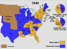 Durant la guerre américano-mexicaine, les généraux Taylor et Scott s'étaient révélés comme des candidats potentiels pour le Parti whig, de même que le sénateur Thomas Corwin, opposé à la guerre, et le chef du parti de longue date, Henry Clay. La popularité de Taylor gagna en importance à mesure que la guerre continuait et il déclara en 1847 qu'il n'excluait pas l'idée de se porter candidat à la présidence[146]. La convention nationale whig qui se déroula le mit aux prises Taylor, Clay, Scott et le sénateur du Massachusetts Daniel Webster. Taylor arriva en tête du premier tour juste devant Clay et parvint à rassembler suffisamment de soutiens autour de sa candidature pour décrocher la nomination au quatrième tour de scrutin. Clay déplora le choix de Taylor car ce dernier, très ambigu sur le plan idéologique, ne disposait pas d'un programme politique précis[147]. Polk critiqua également Taylor en privé en affirmant à son sujet : « il n'est pas du tout qualifié »[148]. Un ancien membre du Congrès originaire de l'État de New York, Millard Fillmore, fut désigné en tant que colistier[147].