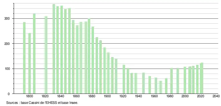 L'évolution du nombre d'habitants est connue à travers les recensements de la population effectués dans la commune depuis 1793. Pour les communes de moins de 10 000 habitants, une enquête de recensement portant sur toute la population est réalisée tous les cinq ans, les populations légales des années intermédiaires étant quant à elles estimées par interpolation ou extrapolation[41]. Pour la commune, le premier recensement exhaustif entrant dans le cadre du nouveau dispositif a été réalisé en 2005[42].