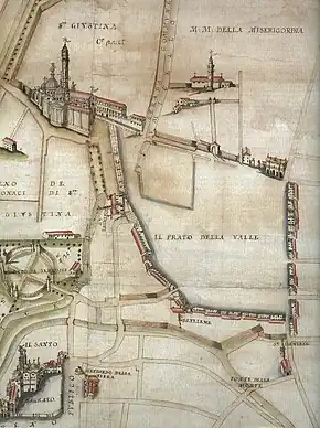 En 589, une série d'importantes inondations fit sortir de leur lit de nombreux fleuves de la plaine du Pô. Ainsi, le Brenta modifia son cours, le déplaçant au nord du centre urbain de Padoue. De la même façon le Bacchiglione déborda lui aussi et vint inonder la cité. C'est à la suite de ces inondations que le Prato della Valle se transforma en un lieu marécageux et fut presque totalement abandonné par les habitants de la ville.