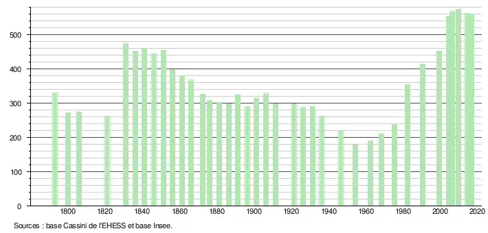 L'évolution du nombre d'habitants est connue à travers les recensements de la population effectués dans la commune depuis 1793. Pour les communes de moins de 10 000 habitants, une enquête de recensement portant sur toute la population est réalisée tous les cinq ans, les populations légales des années intermédiaires étant quant à elles estimées par interpolation ou extrapolation[7]. Pour la commune, le premier recensement exhaustif entrant dans le cadre du nouveau dispositif a été réalisé en 2004[8].