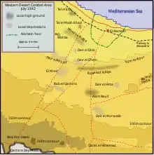 La limite sud de l’offensive est marquée par la dépression de Qattara qui était impraticable par les chars et la plupart des autres véhicules militaires en raison de ses caractéristiques spécifiques telles que la présence de lacs salés, de hautes falaises, d'escarpements et de fech-fech. Les falaises, en particulier, ont agi comme une muraille infranchissable, ce qui signifiait que la position britannique ne pouvait pas être débordée.