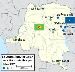 La situation début janvier 1997. L'est du Zaïre est contrôlé par l'AFDL. Les FAZ préparent une contre-offensive depuis Kisangani et Kindu.