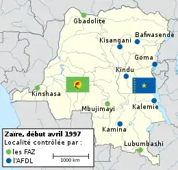 La situation début avril 1997. Les FAZ viennent alors de perdre Kamina (), l'AFDL va bientôt conquérir tout le Shaba et le Kasaï oriental.