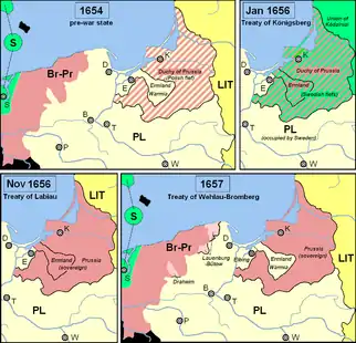 De même le Brandebourg quitte l'alliance suédoise après que la Pologne a retiré ses revendications sur la Prusse ducale lors des traités de Welhau le et de Bromberg le [24],[26]. De plus, les traités sécurisaient le contrôle par le Brandebourg des villes de Lębork et de Bytów à la frontière de la Poméranie suédoise tandis que l'évêché de Varmie était rendu à la Pologne[24].