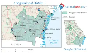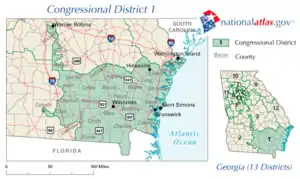 Le 1er district congressionnel de Géorgie est un district de l'État américain de Géorgie. Il est actuellement représenté par le Républicain Buddy Carter , bien que les limites du district aient été redessinées à la suite du recensement des États-Unis de 2010 , qui a accordé un siège supplémentaire à la Géorgie. La première élection utilisant les nouvelles limites du district a été les élections au Congrès de 2012.