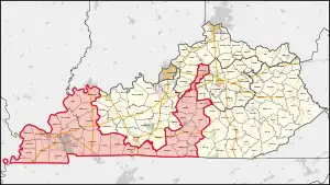 2013–2023 Adair, Allen, Ballard, Caldwell, Calloway, Carlisle, Casey, Christian, Clinton, Crittenden, Cumberland, Fulton, Graves, Henderson, Hickman, Hopkins, Livingston, Logan, Lyon, Marshall, Marion, McCracken, McLean, Metcalfe, Monroe, Muhlenberg, Ohio, Russell, Simpson, Taylor, Todd, Trigg, Union et Webster. | |||||