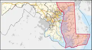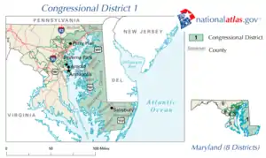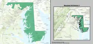 Le 1er district congressionnel du Maryland englobe toute la côte est du Maryland, y compris Salisbury, ainsi que le Comté de Harford et des parties du Comté de Baltimore ; c'est le plus grand district congressionnel de l'État géographiquement, couvrant 11 comtés (en tout ou en partie).