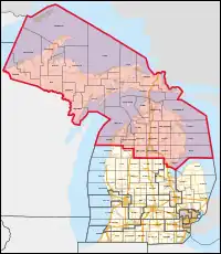 Sur les 83 comtés du Michigan, les 35 suivants se trouvent entièrement dans le district. Un comté (Wexford) se trouve partiellement dans le district.