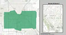 Le 1er district congressionnel du Nevada occupe une partie des communautés du Comté de Clark à l'est de l'Autoroute de Las Vegas et au sud de la Base aérienne de Nellis, y compris des parties de Las Vegas, la plupart de Henderson, Paradise, Sunrise Manor et Winchester, ainsi que l'ensemble de Boulder City, Nelson et Whitney. Avec un indice CPVI de D+3, c'est l'un des districts les plus Démocrates du Nevada[1].
