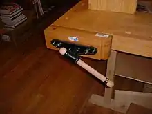 Cette presse à chariot traditionnelle utilise également une grande vis, en bois ou en métal. Il se compose d'un bloc mobile avec un ou plusieurs trous de butée, le bloc mobile se déplace dans une grande mortaise de l'établi. La mâchoire a une face qui entre en contact avec le plateau de l'établi, et les trous de butée sont alignés avec les trous de butée du plateau de l'établi. Les deux principales variétés de cette presse varient selon que l'écrou est monté dans l'établi ou sur le bloc de trous d'entraînement. Lorsque l'écrou est monté sur le bloc de trous, l'installation est plus compliquée et plus coûteuse, mais la vis ne bouge pas lorsque l'étau est utilisé.