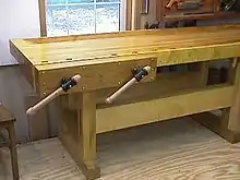 Etabli de menuisier avec presse verticale.