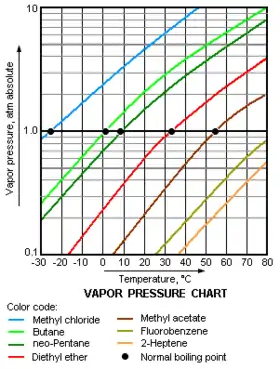 La température d'ébullition standard d'un corps, couramment appelée point d'ébullition, est la température à laquelle la pression de vapeur saturante est égale à 1 bar. La température d'ébullition est encore souvent reportée à 1 atm. On parle alors de température d'ébullition normale d'un corps. Lorsque la température du liquide devient supérieure à cette valeur, on observe la formation de bulles à l'intérieur de la substance : c'est le phénomène d'ébullition. La formation de bulles en profondeur dans le liquide nécessite cependant une pression (et donc une température) plus élevée, car la pression du liquide augmente avec la profondeur.