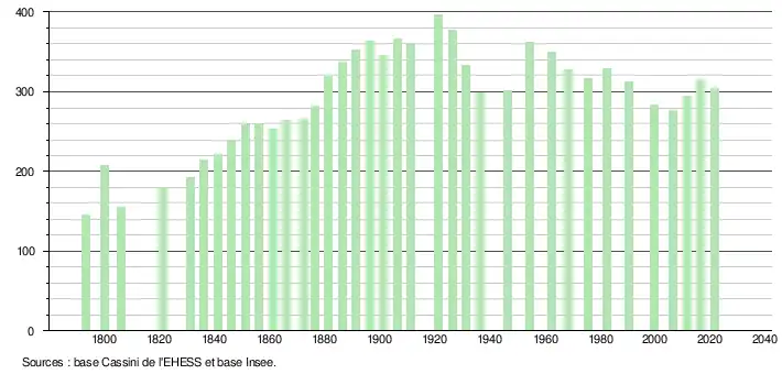 L'évolution du nombre d'habitants est connue à travers les recensements de la population effectués dans la commune depuis 1793. Pour les communes de moins de 10 000 habitants, une enquête de recensement portant sur toute la population est réalisée tous les cinq ans, les populations légales des années intermédiaires étant quant à elles estimées par interpolation ou extrapolation[40]. Pour la commune, le premier recensement exhaustif entrant dans le cadre du nouveau dispositif a été réalisé en 2006[41].