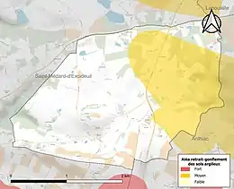 Les mouvements de terrains susceptibles de se produire sur la commune sont des tassements différentiels[36]. Le retrait-gonflement des sols argileux est susceptible d'engendrer des dommages importants aux bâtiments en cas d’alternance de périodes de sécheresse et de pluie[37]. 30,5 % de la superficie communale est en aléa moyen ou fort (58,6 % au niveau départemental et 48,5 % au niveau national métropolitain)[Carte 4]. Depuis le , en application de la loi ÉLAN, différentes contraintes s'imposent aux vendeurs, maîtres d'ouvrages ou constructeurs de biens situés dans une zone classée en aléa moyen ou fort[Note 4],[38].