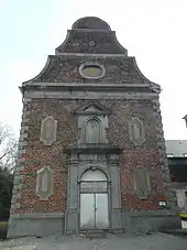 Façade baroque ornée de quatre cartouches panneautés encadrant le portail dessiné en plein cintre à clé et impostes saillantes moulurées, entre deux pilastres dosserets portant un entablement. Au-dessus, haute niche également en plein cintre mouluré, dans un encadrement à crossettess et volutes coiffé d'un fronton triangulaire. Surmontant l'entablement prolongé latéralement en corniche, pignon chantourné à rampants de pierre, percé d'un oculus et barré de chaînes sur larmiers.