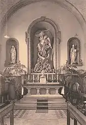 À l'intérieur, les fenêtres sont garnies d'un encadrement enduit à crossettes et rocailles, et séparées par des pilastres engagés. Ceux-ci supportant chacun un arc doubleau en calcaire, entre les voûtes en briques peintes décorées de cinq écussons dont celui de Saint Michel arborant le chronogramme.