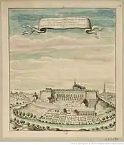 - Veüe de l'Orangerie des Terraces et Pottager // du Chasteau de Thouars // dessine du costé de l'abbaye de S.t Jean de bonneval, 1699, dessin de Louis Boudan sur Gallica