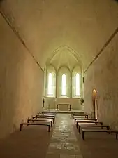 La chapelle du prieuré à simple nef possède une voûte en berceau brisé intacte. Le cœur comprend une abside ouverte par une remarquable voûte à nervures et éclairée par un triplet à larges embrasures intérieures.