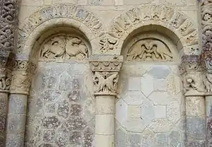 Cette arcature jumelle protège, à gauche, deux quadrupèdes, poitrine contre poitrine, possédant des ébauches d'ailes et se mordillant la queue. À droite, deux oiseaux boivent dans une même coupe. Les colombes buvant dans un calice sont une représentation des âmes qui boivent à la source de la mémoire. C'est un emprunt de l’Église à l'iconographie traditionnelle romaine. Pour un chrétien, cette image est le symbole de l'Eucharistie : "Vous puiserez l'eau avec joie aux sources du salut" (Isaïe, 12-3). Elle est courante dans les églises romanes du département de la Vienne. On la retrouve à l'église Saint-Pierre de Chauvigny, à l'église de Bonneuil-Matours, à l'église de Civaux, à celle de Liniers et à l'église Saint-Hilaire de Melle (département des Deux-Sèvres).