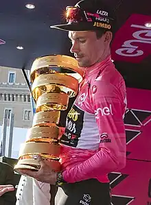 Il s'aligne sur le Giro dont il est l'un des favoris avec Remco Evenepoel. Un peu en retrait dans le contre-la-montre inaugural, il voit Evenepoel (qui abandonne, positif au Covid) puis Geraint Thomas prendre le maillot rose. Les étapes de montagne aux forts pourcentages ne lui permettent pas de distancer Thomas qui aborde le contre-la-montre de la 20e étape avec 26 secondes d'avance sur Primož Roglič. Proche de la Slovénie et très montueux, ce contre-la-montre est gagné par Roglič au sanctuaire de Lussari (Svete Višarje), et il s'empare du maillot rose avec 14 secondes d'avance sur Thomas[28]. Par cette performance, Roglič efface sa terrible désillusion de la 20e étape du Tour de France 2020[29]. Le 28 mai, Roglič remporte le Tour d'Italie, son quatrième grand tour[30].