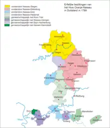 La principauté de Nassau-Siegen (en jaune) dans le cercle du Bas-Rhin-Westphalie.