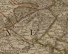 - le val de Senones[7] comprenant le bourg de Senones qui devint capitale de la principauté ainsi que Ménil[8], Belval[8],[9], Châtas[8],[10], Moussey[8],[11], La Petite-Raon[8],[12], Le Puid[8],[13], Le Vermont[8],[14], Vieux-Moulin[15], Saint-Maurice-lès-Senones[8], les Frénot, Le Saulcy[8],[16] et Le Mont[8],[17] ;