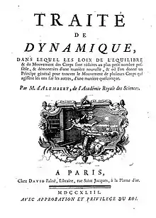 Traité de dynamique par Jean Le Rond d'Alembert, 1743. Le savant français y énonça le principe de la quantité de mouvement, également connu sous le nom de «Principe de d'Alembert».