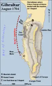 Ne rencontrant aucune résistance, le prince Georges de Hesse-Darmstadt débarque au nord de la ville avec 1 800 soldats anglais et néerlandais. Postés sur les collines environnantes, les Espagnols sont dispersés par le feu de deux navires envoyés à l'est du rocher.