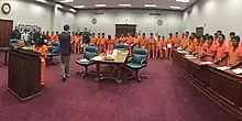 C'est dans les années 1970 qu'apparaît le célèbre uniforme orange. Cette couleur est choisie en raison de sa forte visibilité, permettant de distinguer les prisonniers au milieu de civils. En effet, cet uniforme orange n'est généralement pas porté à l'intérieur de la prison mais lors de transferts, du procès ou de travaux en extérieur. Il est popularisé du grand public grâce aux médias (notamment les photos de détenus de Guantanamo) et à la fiction (par exemple la série télévisée Orange is the New Black)[38].